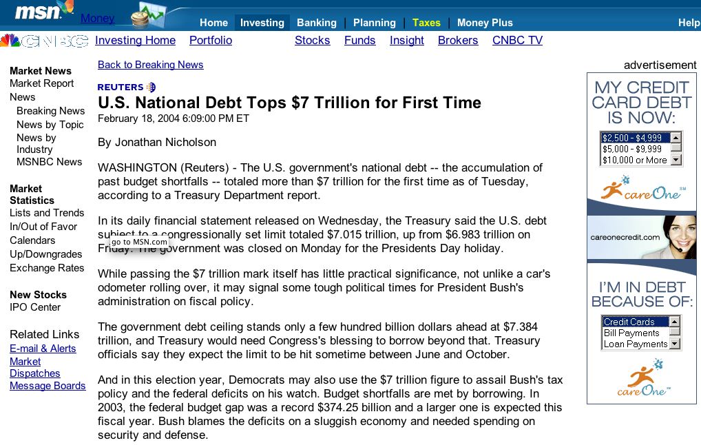 I was about to click away from this relatively boring article about the US debt being over $7 trillion dollars when I notice the ad on the page. The ad is for some sort of credit card/debt reduction thing. It’s too bad there wasn’t an option in the selection box that said “sluggish economy, security and defense.” I guess it’s irony or comedy or whatever you want to call it. Regardless, it amused me. Oh, the US debt is also at $7 trillion, that’s a lot of money. Now, it’s all imaginary money, but it’s still a lot.