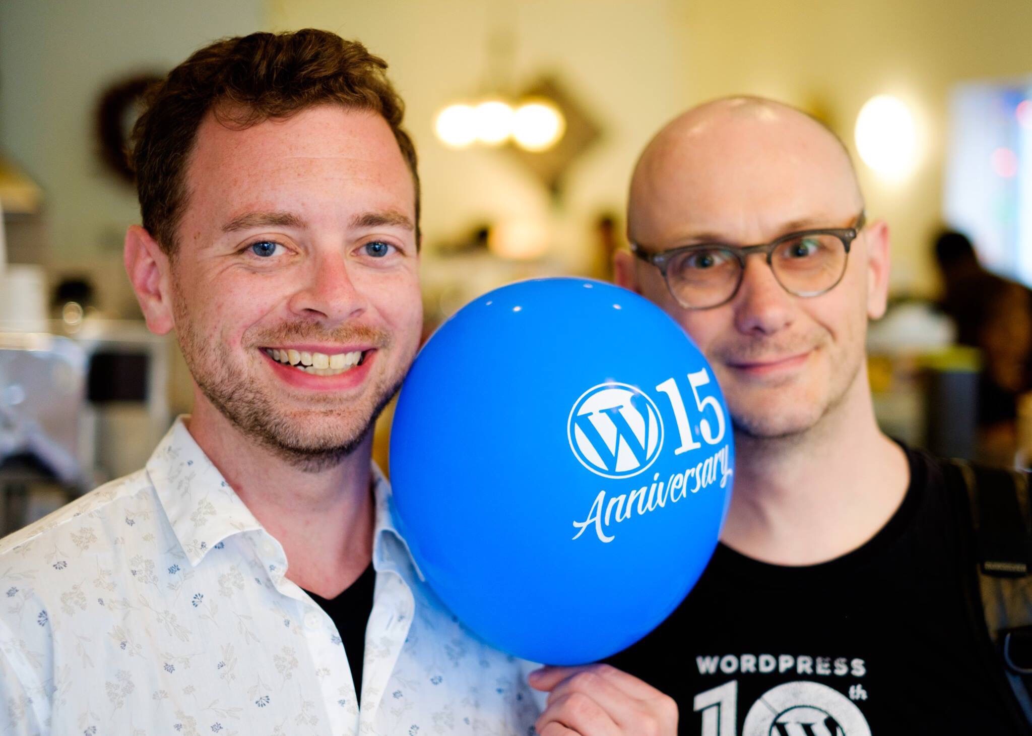 Photo of me and Michal Bluma from the Montreal WordPress 15th anniversary meetup (by Jer Clarke)