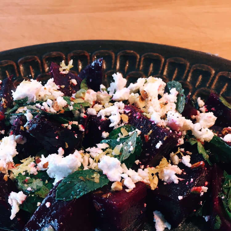 Beetroot salad turned out well. Roasted in the oven; with a mint dressing, some parsley, feta, pistachios and lemon zest.